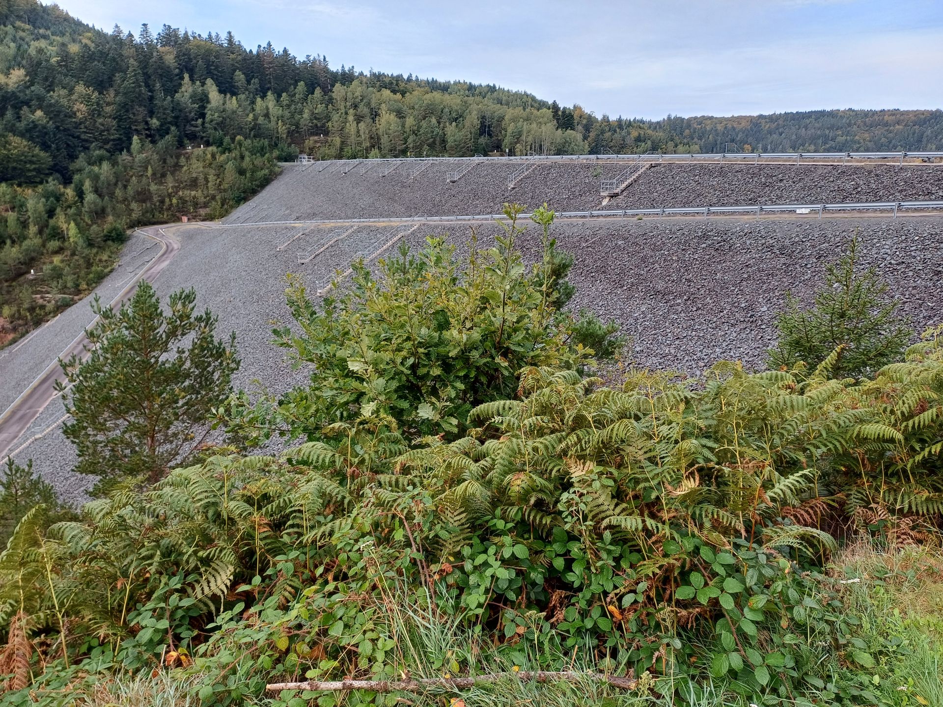 Un premier chemin traversant la foret nous conduit au barrage du lac de Pierre Percée. Avec une bonne surprise le ciel se dégage et laisse les rayons du soleil réchauffer la fraicheur du matin.